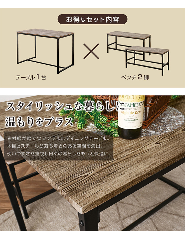 | タイプ | ダイニング3点セット テーブル×1台、ベンチ×2脚 |