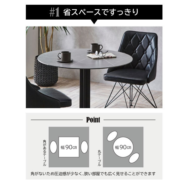 円形テーブルは動線を邪魔しにくく、限られたスペースでも人数の出入りがしやすい設計です。天板はセラミックとガラスの積層構造で日常のキズや汚れに強く、食後はサッと拭くだけで清潔を保てます。脚部は粉体塗装のスチールで耐久性に優れ、床面の微妙な段差はアジャスターで調整可能。チェアはPU×ウレタンでほどよいクッション性があり、座面回転により立ち座りや方向転換がスムーズ。グレーやアイボリーの落ち着いた色調は北欧やモダン、カフェ風のインテリアにも自然に馴染みます。朝食からワーク、来客時のティータイムまで幅広いシーンで活躍し、組み立ても手順が分かりやすく到着後すぐに使い始められる実用的な3点セットです。