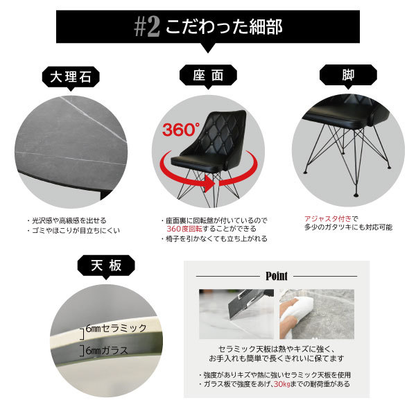 | 特徴 | ・省スペースですっきり ・ホワイトを基調とした清涼感あるモデル ・座面360度回転 ・脚部はアジャスタ付きで滑りにくい ・キズや熱に強く、汚れても安心なセラミック天板使用 |