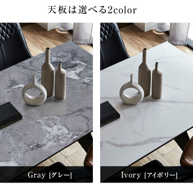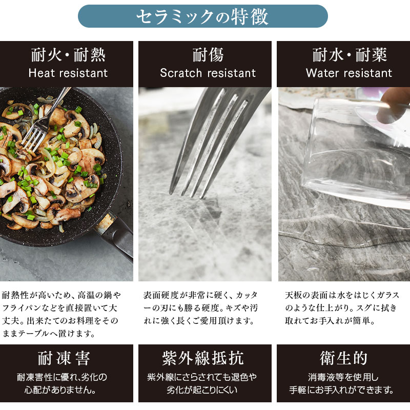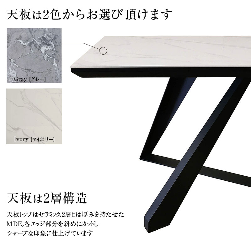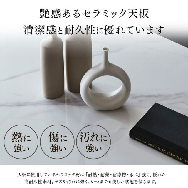 | 特徴 | ・艶感あるセラミック天板が洗練されたモダンな空間を演出 ・天板カラーは清潔感あるアイボリーとシックでスタイリッシュなグレーの2色対応 ・天板はアーバンテイストな光沢感ある仕上げの6mmセラミック天板 ・テーブル脚は縁部を斜めにカットしシャープな印象を与えるデザイン ・天板サイズは広すぎない160cmサイズを採用 |