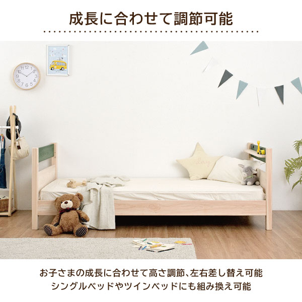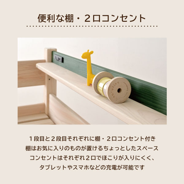 | 特徴 | ・2段間高さ調節可能、左右差し替え可能 ・上下段ベッド ・組替え可能 2段ベッド/ツインベッド/シングルベッド ・棚、2口コンセント付き ・低ホルムアルデヒド ・SG規格相当 |