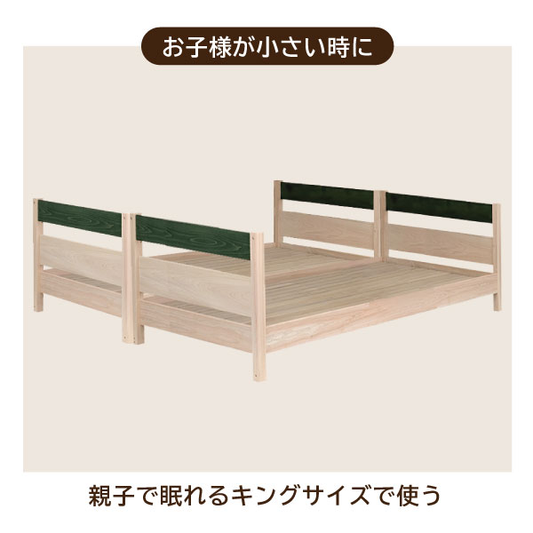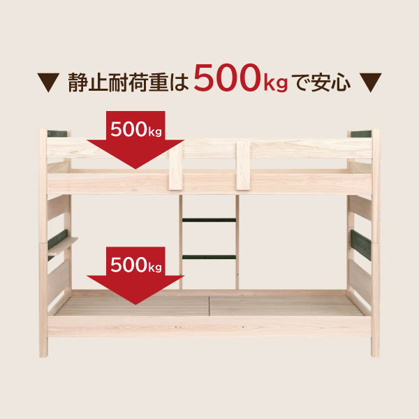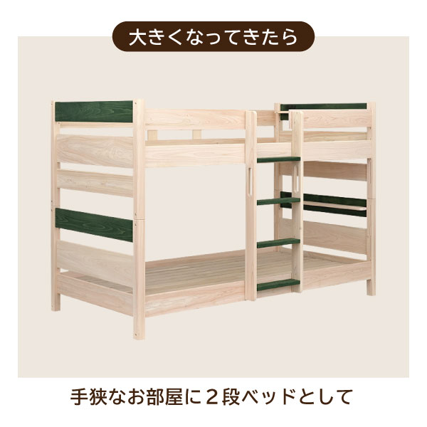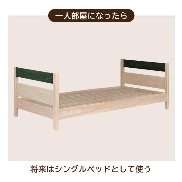 お子さまの成長とともに、形を変えて長く使える国産二段ベッド「ベアン」。 日本製ならではの丁寧な造りと、天然ひのき・桐を活かした優しい木の質感が魅力です。 上段と下段を分けてツインベッドやシングルベッドとしても使える3Way仕様。成長に合わせて使い方を変えられるため、新生活や兄弟姉妹での共有にもぴったりです。 フレームには国産ひのきを使用し、すのこ部分には軽くて通気性に優れた桐材を採用。高温多湿な季節でも快適な眠りをサポートします。 さらに、宮棚には便利な2口コンセントを備え、照明や充電もスムーズに。安全面にも配慮した設計で、上下段の高さ調節やサイドの差し替え対応など、細部にまでこだわりました。 塗料には水性塗装を使用し、低ホルムアルデヒドで安心。SG規格に相当する品質基準を満たした、信頼の日本製モデルです。 ナチュラル・ブラウン・グリーンの3色から、お部屋に合ったカラーをお選びいただけます。 お届けについて 送料無料(※北海道・東北・沖縄・離島は別途お見積もり) ※組立式・5個口配送 ※設置サービスは別途料金にて対応可能です。事前にお問い合わせください。