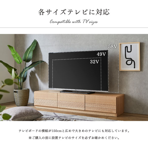 木目調の落ち着いた質感が空間に温かみを与えるテレビボードです。二種類のカラーから選べ、どんなリビングにも自然に溶け込みます。隠す収納と見せる収納を組み合わせた設計で、周辺機器や小物をすっきりまとめられるため、日々の暮らしが整いやすくなります。ガラス扉は閉じたままでも電波が届く仕様で、利便性と安心感を両立。広々と使える天板はテレビの配置がしやすく、リビングの中心として長く活躍します。木製ならではのやさしい表情が暮らしに馴染み、快適に使えるバランスの良いテレビボードに仕上げています。