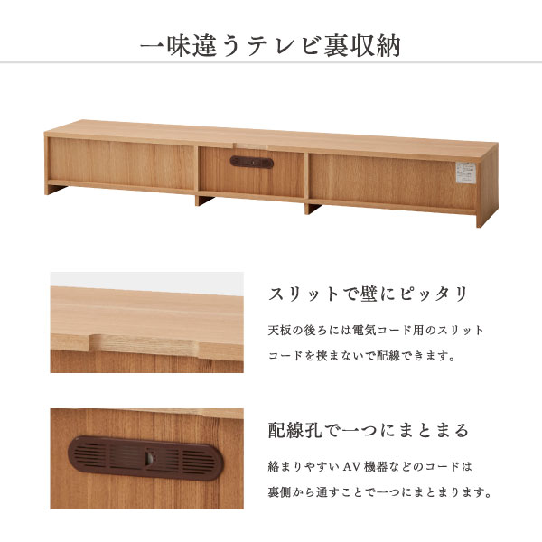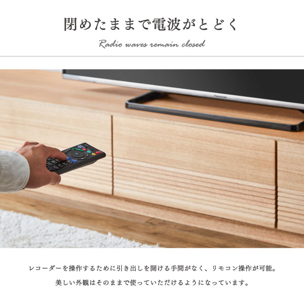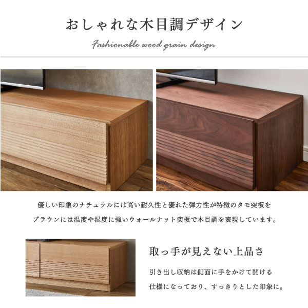 木目調の豊かな表情が印象的なテレビボードです。幅180cmのワイド設計で、リビングの中心となるテレビ周りをゆったりとレイアウトできます。扉付きの収納部には周辺機器や小物をまとめてしまうことができ、ガラス扉は閉じたままでもリモコン操作に配慮した仕様で、見た目のすっきり感と使いやすさを両立しています。引き出し収納には日常使いの小物やリビング雑貨を整理しやすく、オープンスペースにはプレーヤー類やお気に入りのインテリアをディスプレイできます。ブラウンとナチュラルの二色展開で、落ち着いたコーディネートから明るいインテリアまで幅広く合わせやすく、長く暮らしに寄り添うリビングボードとして活躍するテレビボードです。