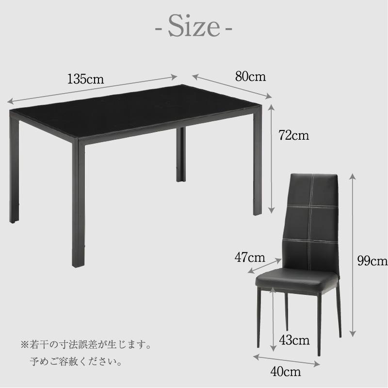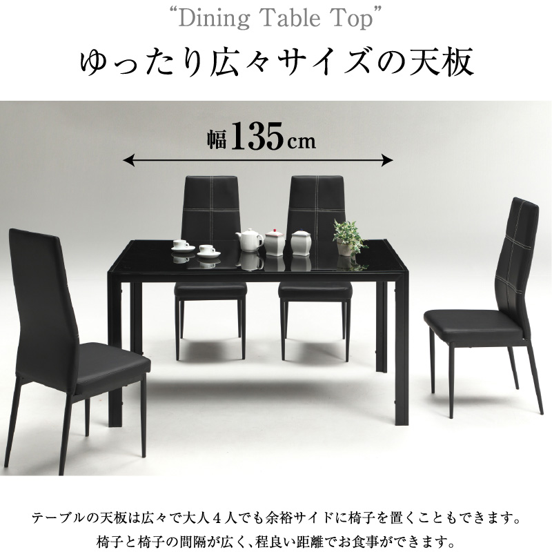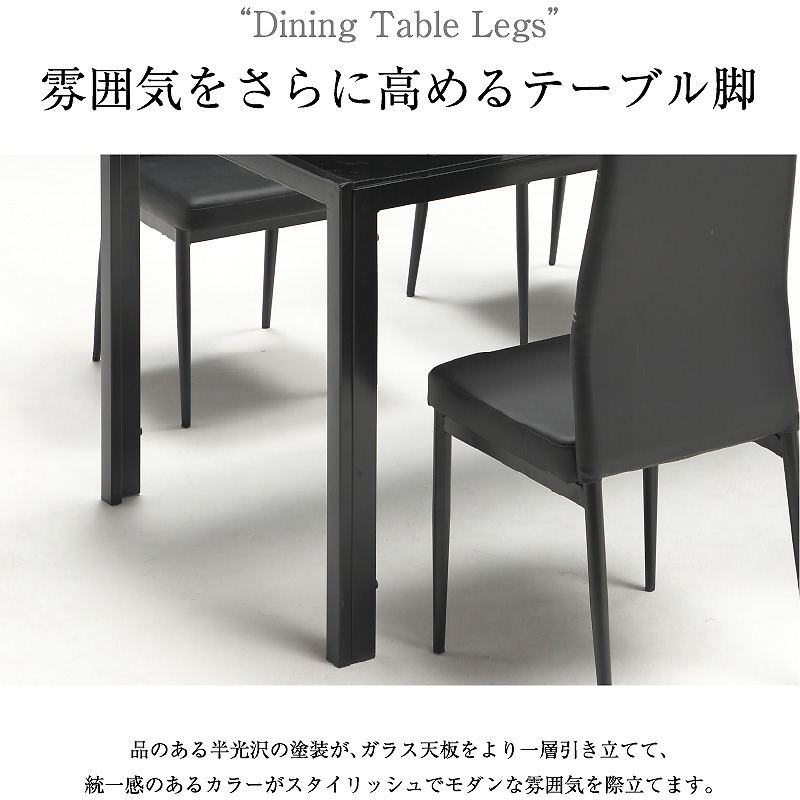 | 特徴 | ・テーブルは、お掃除や手入れがしやすいガラストップ ・スタイリッシュなアイアンの脚 ・テーブル幅135cmのワイド4人掛け ・チェアは適度なクッション ・PU素材でお手入れ簡単チェア ・テーブルと同色のチェア |