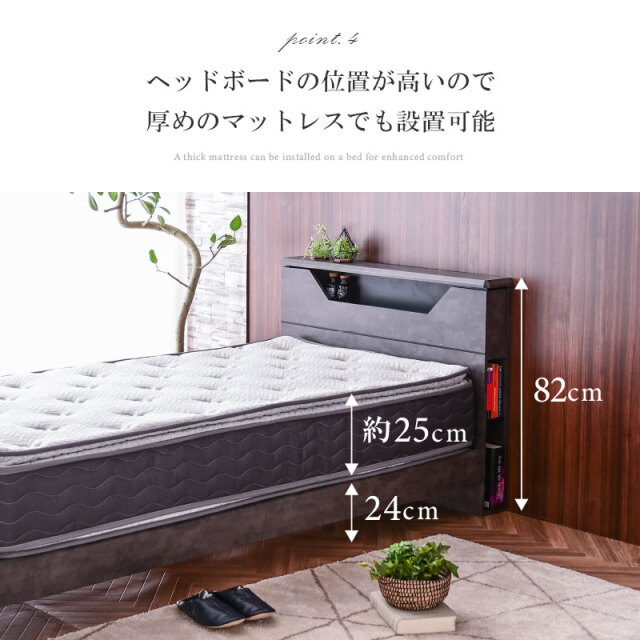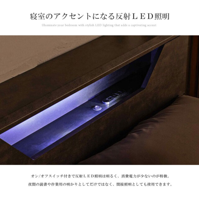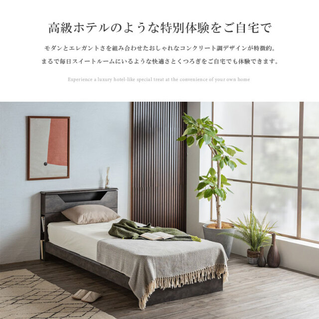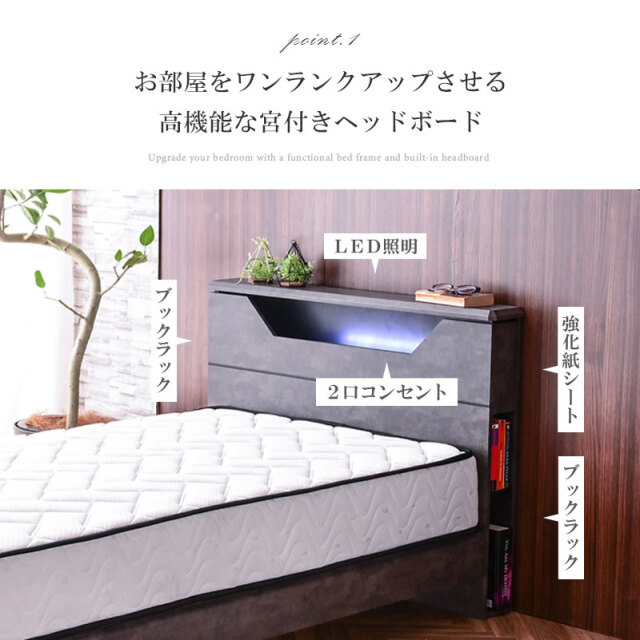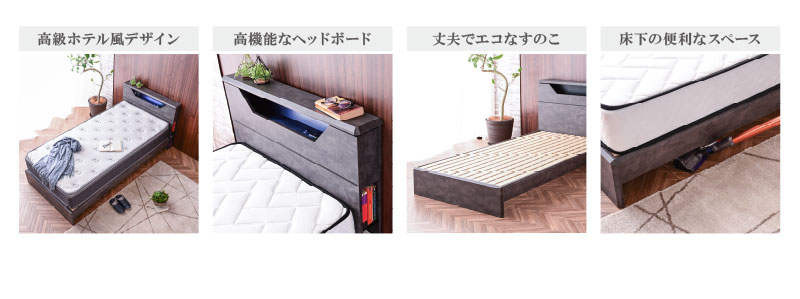 | 特徴 | ・ホテルライクなインテリアデザイン ・丈夫で湿気を逃す環境にやさしいすのこ ・寝室のアクセントになるLED照明 ・便利な2口コンセント ・両サイドにブックラック ・床下の便利なマルチスペース |