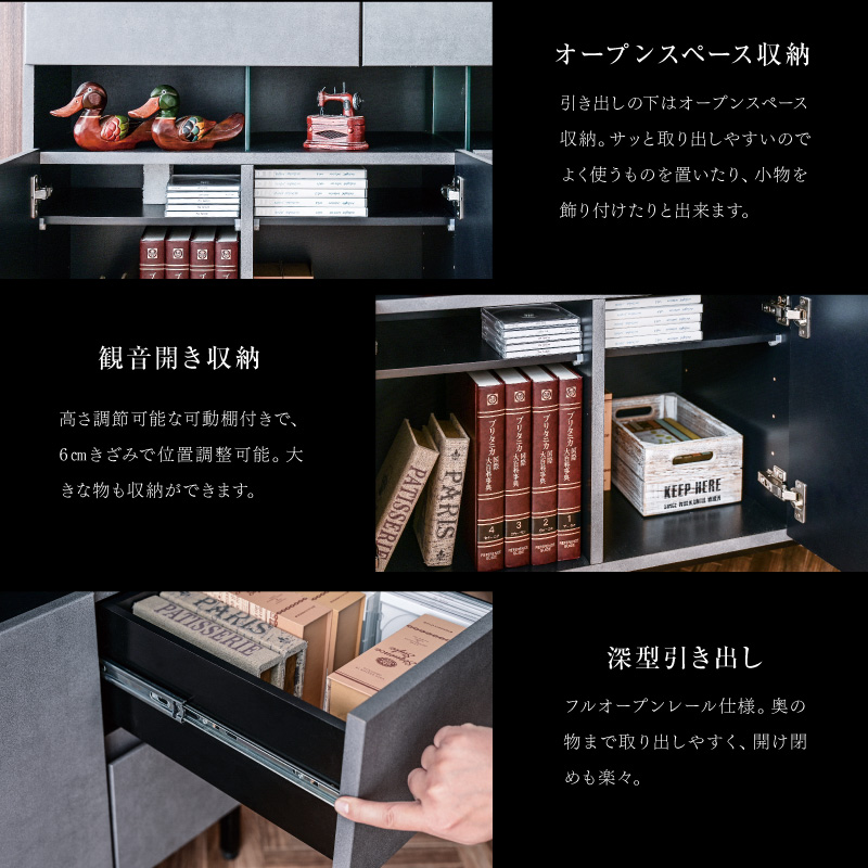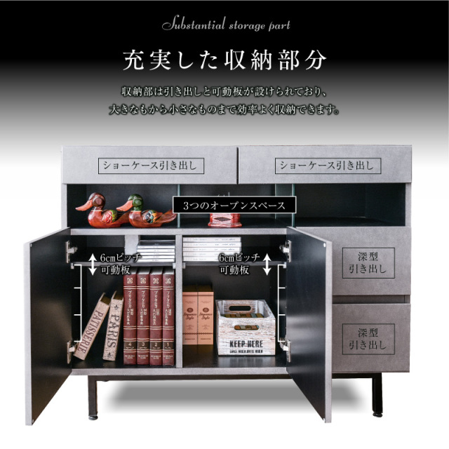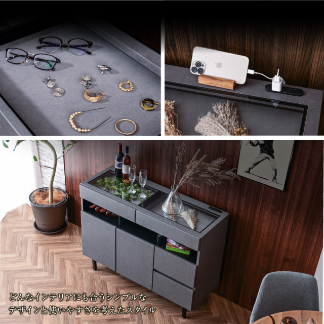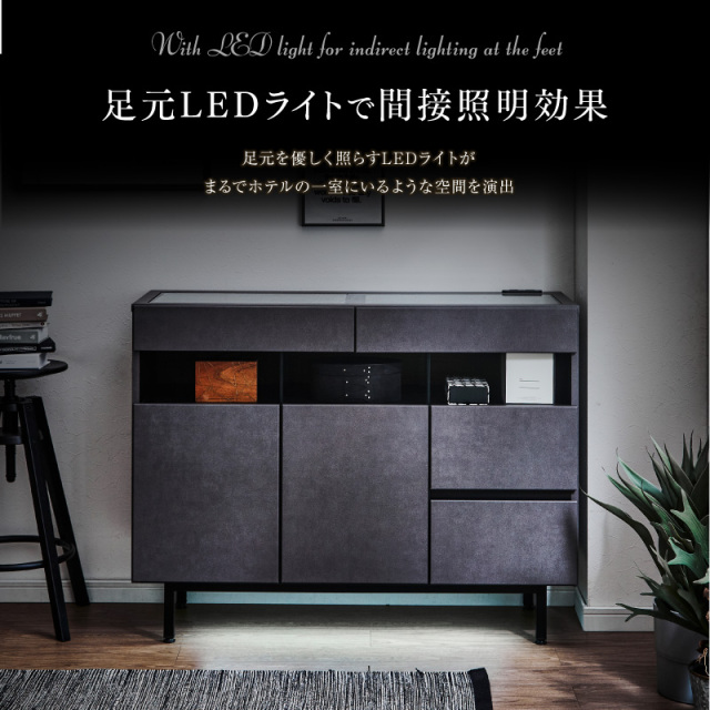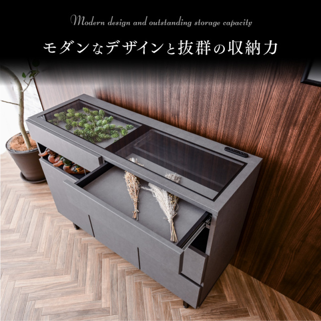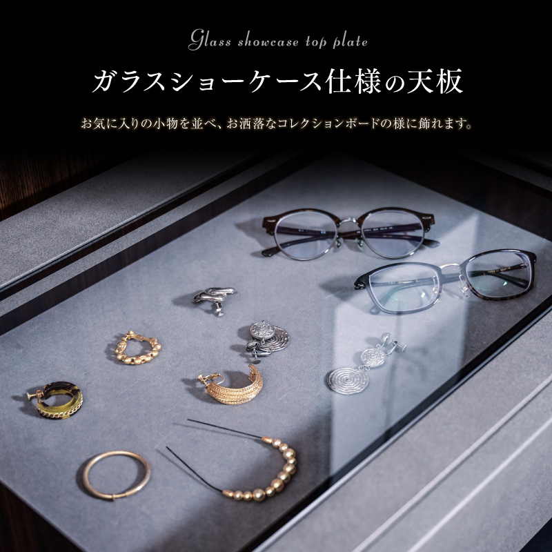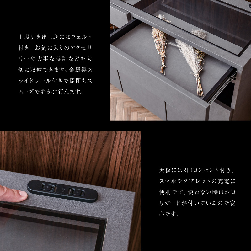 | 特徴 | ・完成品(脚のみお客様にて取付け) ・フルオープンレール引き出し ・天板は強化ガラス張りでショーケースとして ・ショーケース引き出し底はフェルト付き ・充電に便利な2口コンセント ・足元はLED間接照明 ・観音開きの収納棚は可動式で便利 ・右側収納は深型でたっぷり収納可能 |