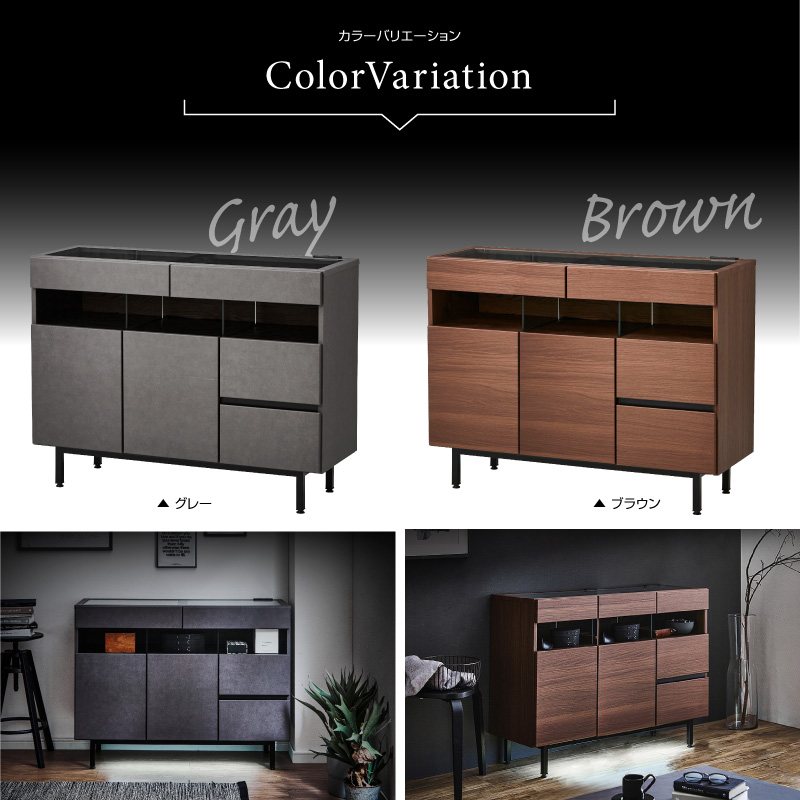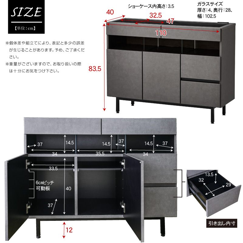 【サイズ】 幅110×奥40×高83.5(cm) 【材質】 MDF、強化シート 天板トップ:強化ガラス、脚:スチール(ブラック) 【カラー】 グレー(セラミック風) ブラウン(木目調) 【重量】 約65kg 【特徴】 ・完成品(脚のみお客様にて取付け) ・フルオープンレール引き出し ・天板は強化ガラス張りでショーケースとして ・ショーケース引き出し底はフェルト付き ・充電に便利な2口コンセント ・足元はLED間接照明 ・観音開きの収納棚は可動式で便利 ・右側収納は深型でたっぷり収納可能 【送料】送料無料 ただし、東北・北海道・沖縄は追加送料が必要となります。(離島は別途お見積り) ※追加料金が必要な場合、買い物カゴでは再計算されません。料金確定後、こちらからご連絡させていただきます。 【ご注意】こちらの商品は大型商品の為、搬入先の通路やドア等の大きさ等をお調べ頂きご注文を頂きますようお願いします。 (入らない等でのご返品には応じ兼ねます) ※お使いのモニターや照明器具等で実際の色とは若干異なって見える場合もございます