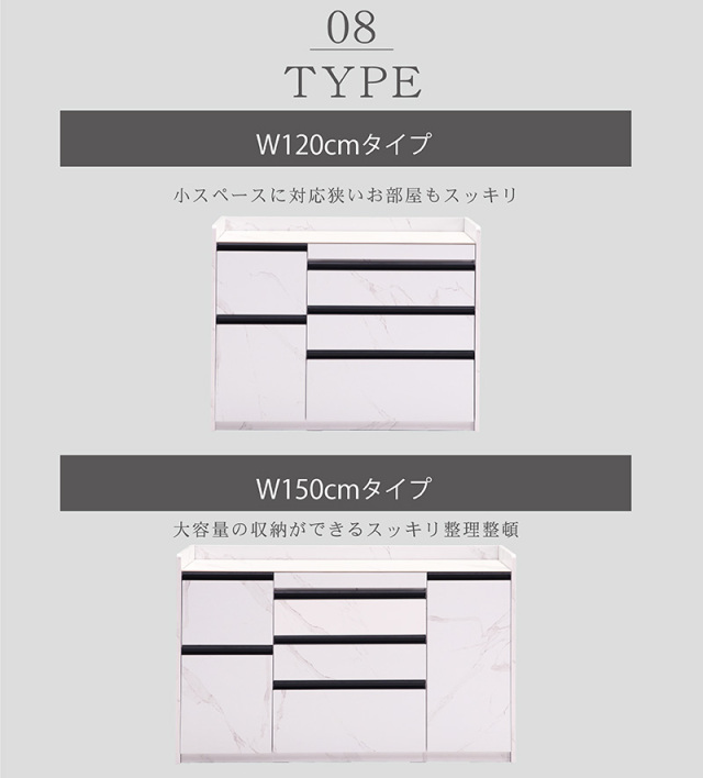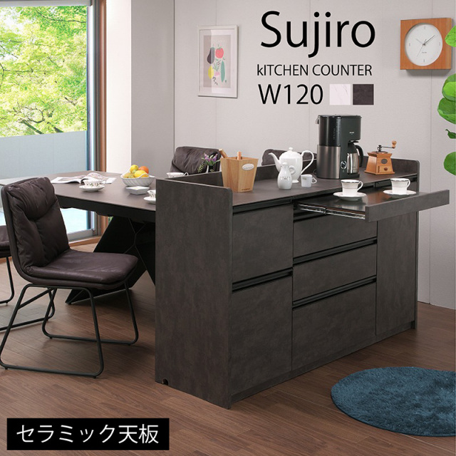 (サイズ) W120タイプ:幅120×奥行き45×高さ90(cm) 重量86kg W150タイプ:幅150×奥行き45×高さ90(cm) 重量99kg (カラー) グレー・ホワイト (表面仕上げ) 天板:セラミック 他:強化紙 (素材) MDF (特徴) ・セラミック天板で熱にも強くフライパンや鍋なども置ける。 ・フルスライドレールで開け閉めが楽 ・キッチン用家電が使える2口コンセント付き ・スライド天板は作業スペースとして使えます。 ・モダン空間に合う2カラー2サイズの展開 ・収納にも便利な小引き出し付き。 ・スタイリッシュなブラックの引手 (送料) 送料無料 ただし、東北・北海道・沖縄は追加送料が必要となります。(離島は別途お見積り) ※追加料金が必要な場合、買い物カゴでは再計算されません。料金確定後、こちらからご連絡させていただきます。 (ご注意) 実物に近い状態で撮影していますが、撮影時の光の加減やお客様のPC設定により若干の色合いが異なる場合がございます。予めご了承ください。