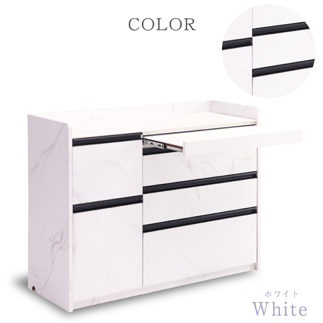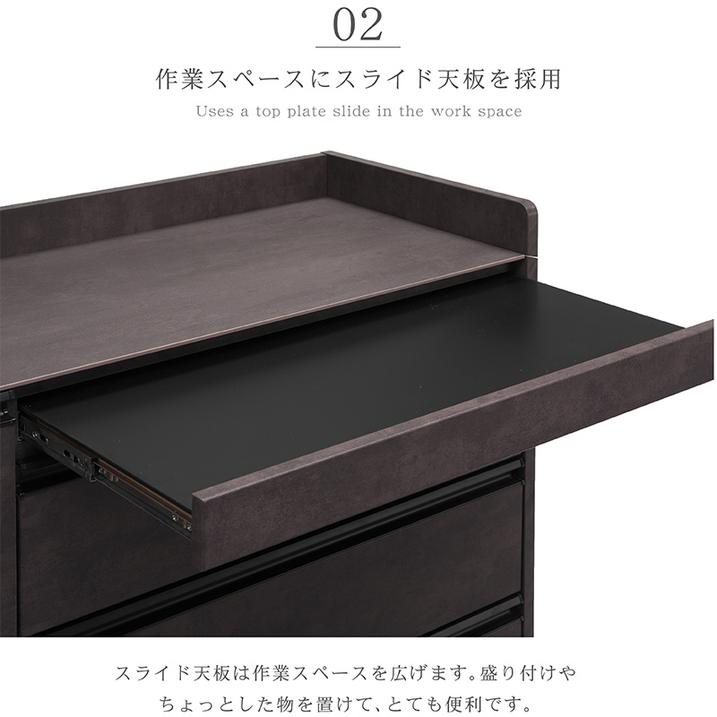 | 特徴 | ・セラミック天板で熱にも強くフライパンや鍋なども置ける。 ・フルスライドレールで開け閉めが楽 ・キッチン用家電が使える2口コンセント付き ・スライド天板は作業スペースとして使えます。 ・モダン空間に合う2カラー2サイズの展開 ・収納にも便利な小引き出し付き。 ・スタイリッシュなブラックの引手 |