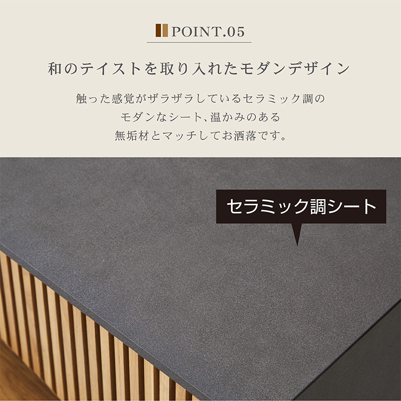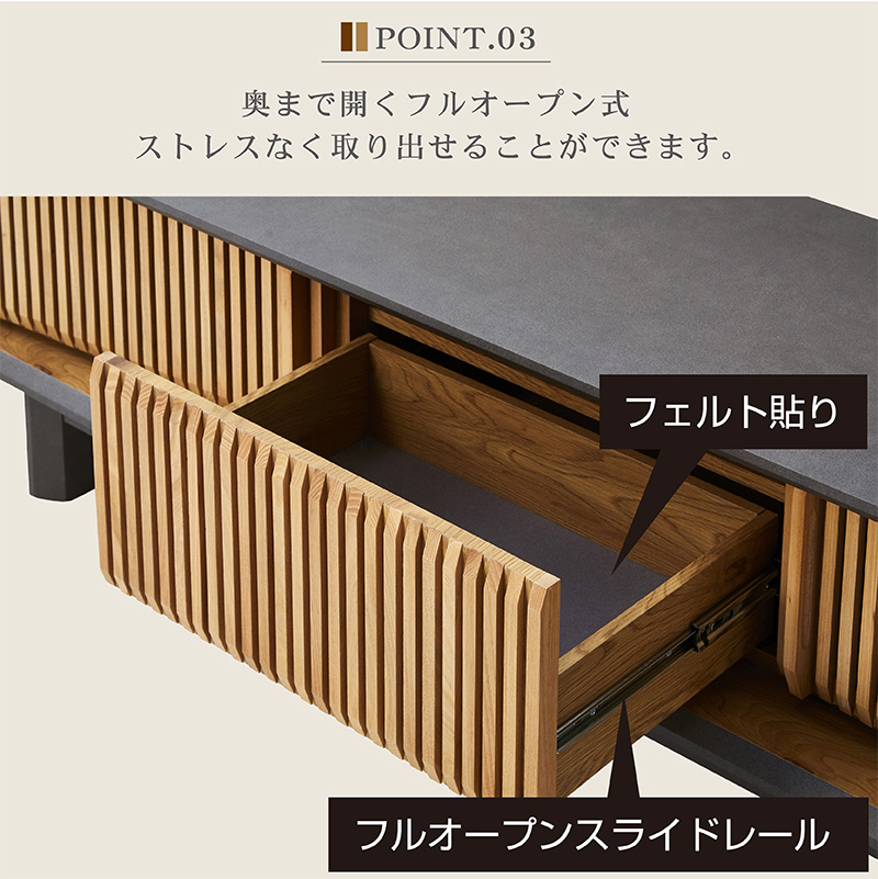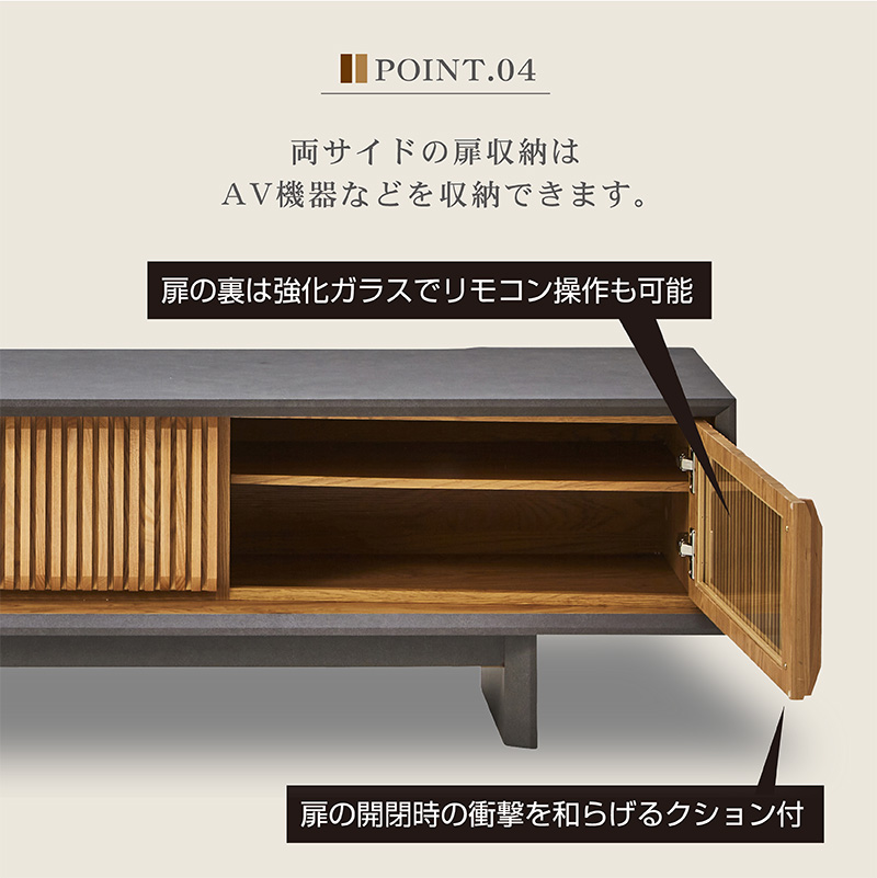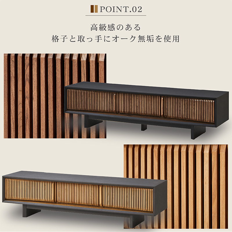 | 特徴 | ・センスのいい和モダンスタイル。 ・豊富なAV機器収納ができる ・引き出しにDVDやCD等を入れられる ・テレビボード上部に外付けハードデスクも置けます ・格子部と取っ手にはオーク無垢 |