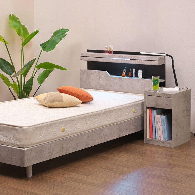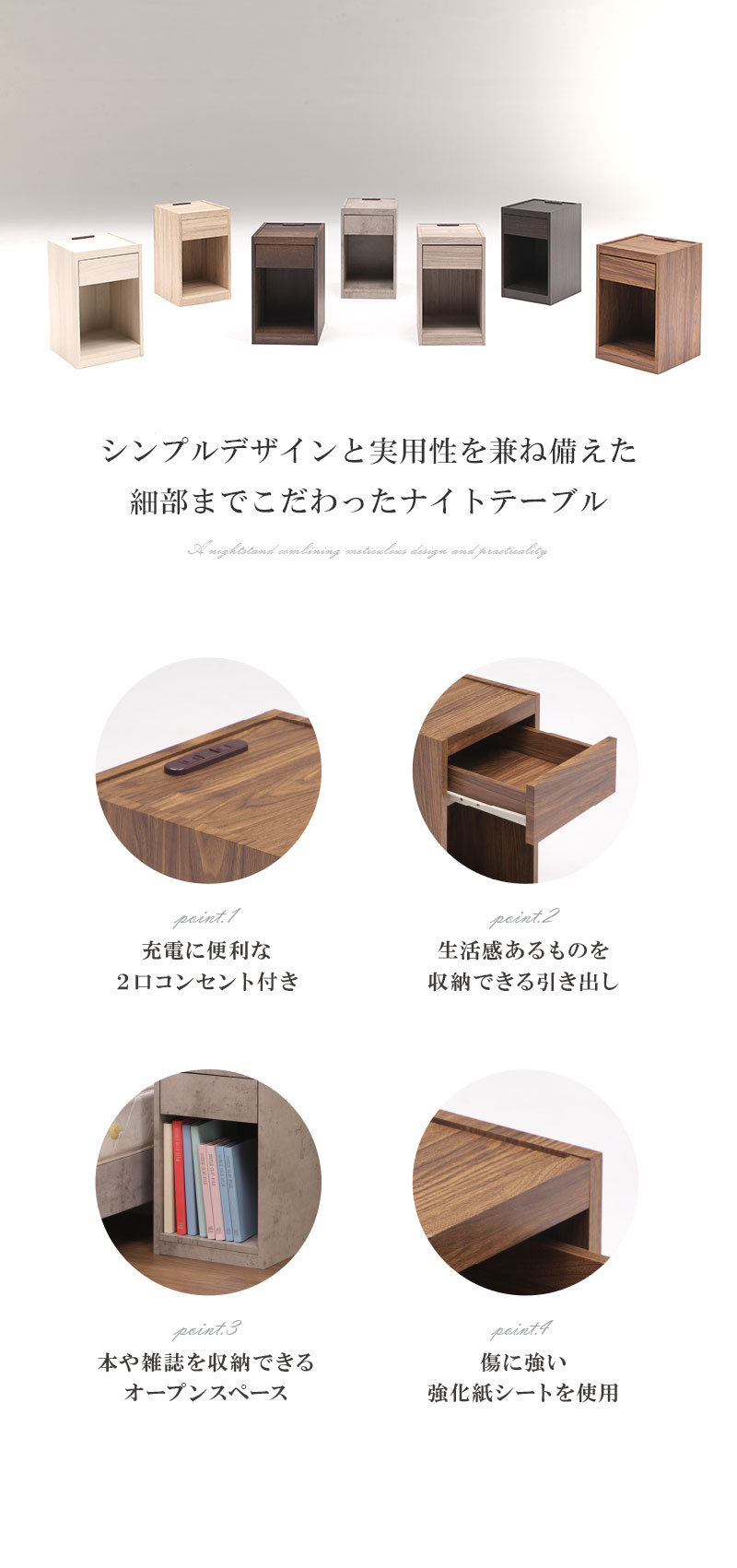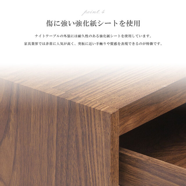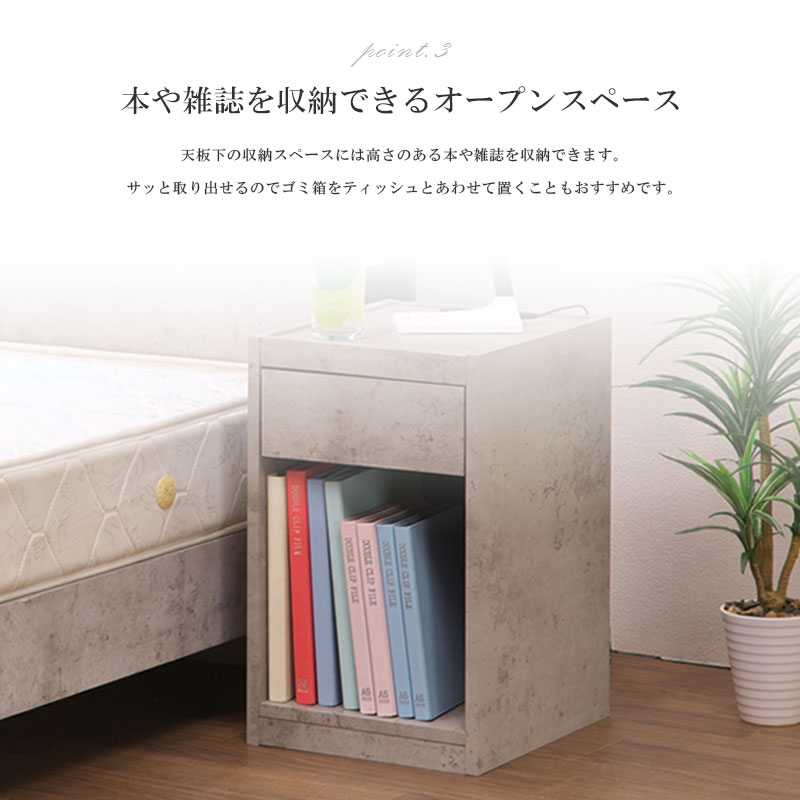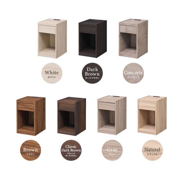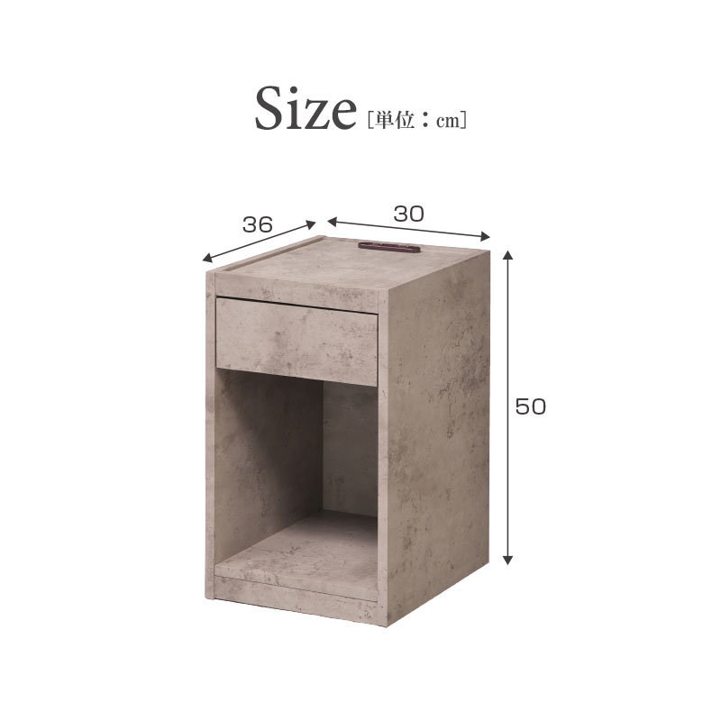 | 特徴 | ・充電に便利な2口コンセント付き ・生活感あるものを収納できる引き出し ・本や雑誌を収納できるオープンスペース ・傷に強い強化紙シートを使用 |