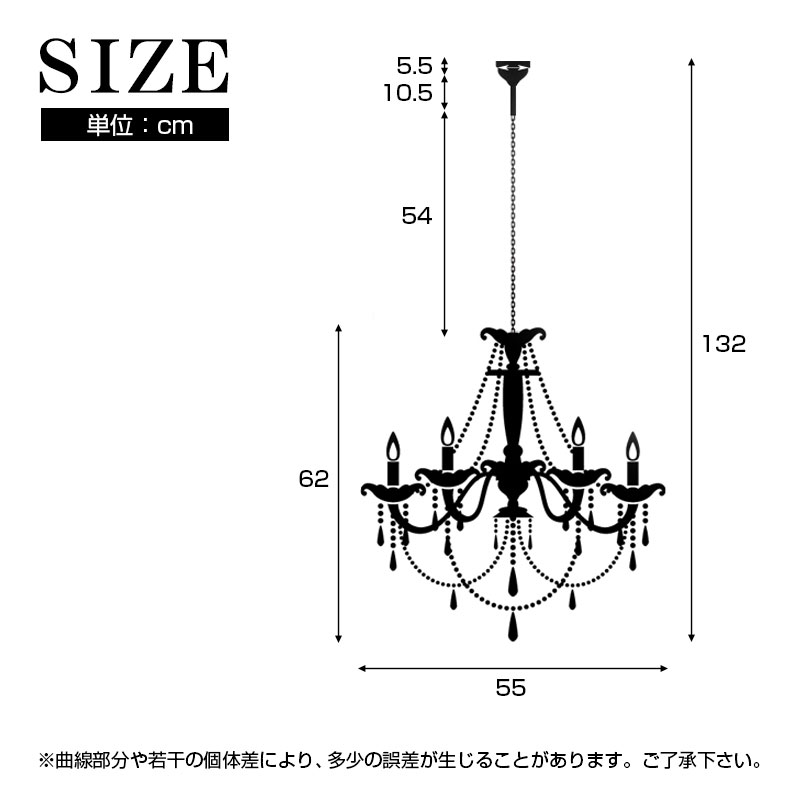 | サイズ | 高さ132×幅55(cm) 【天井から吊るした時の全長】132cm 【シャンデリア本体】高さ62×直径55(cm) 【カップ】高さ5.5×直径10(cm) 【軸長】10.5cm 【チェーン長さ】54cm |