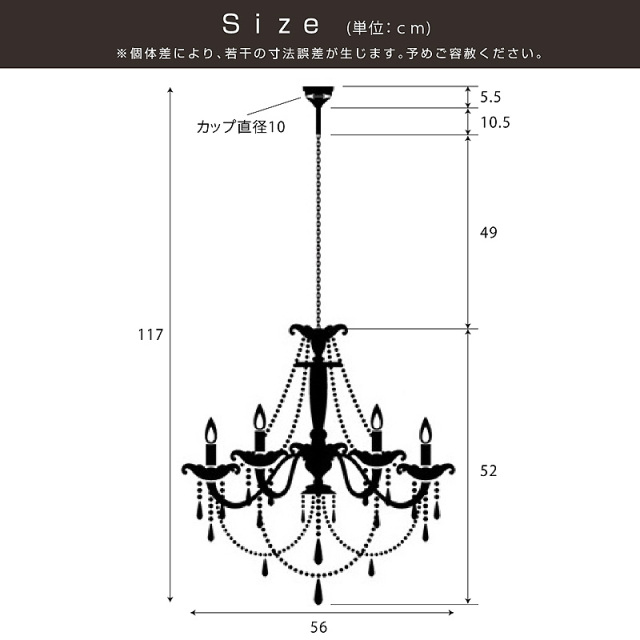 | サイズ(cm) | ・天井から吊るした時の全長:122 ・シャンデリア本体:直径56×高さ52 ・カップ:直径10×高さ5.5 ・軸長:10.5 ・チェーン長さ:54 |