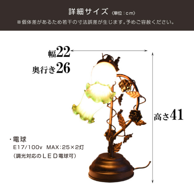 | 対応する電球 | 電球:E17/100V MAX25W×2灯 付属の電球は点灯テスト用のものです。 切れてしまった場合はホームセンター等でお買い求めください。 |
