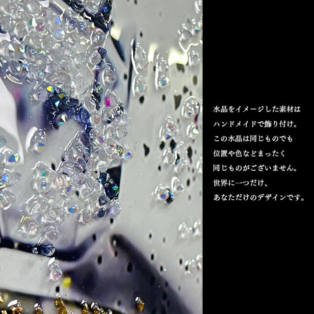 | 特徴 | ・水晶はハンドメイドで飾りつけし、高級感と立体感にこだわりました。 ・太陽光や照明の光を複雑に透過や屈折で光の乱舞を作り出して楽しむことができます。 ・飾る場所の照明の色味によって雰囲気が変わります。 ・上品なブラックカラーのフレームと裏面紐付き。 |