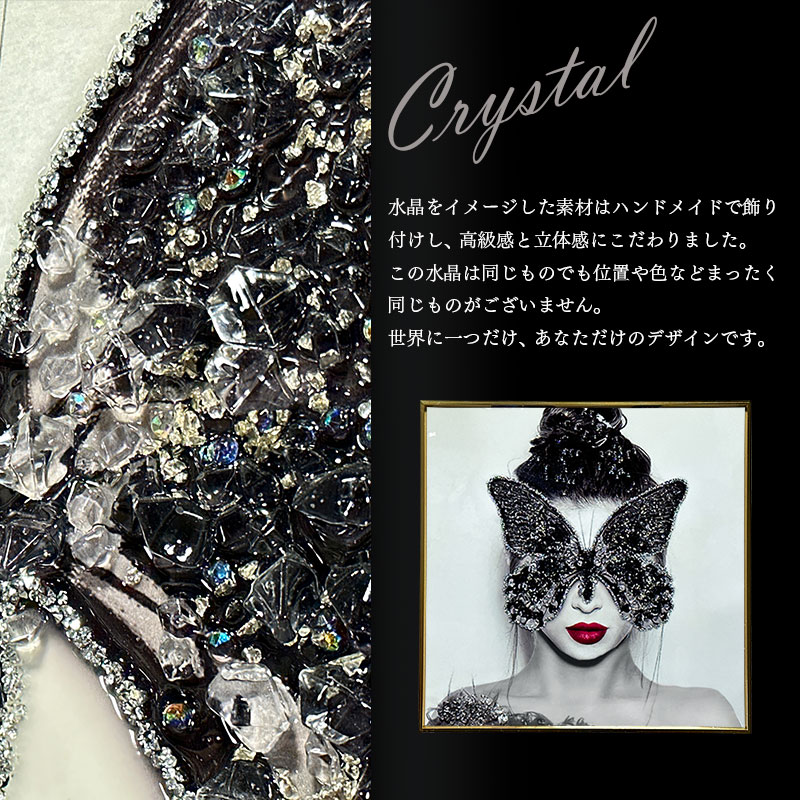 【商品について】 水晶パネル SX211A ■製品寸法 幅50×奥行4×高さ50(cm) ■注意事項 ・ハンドメイドでの貼り付けのため、水晶風パーツの個数・配置に個体差がございます。 ・本商品には重量がございます。壁掛けて取り付け頂く際は必ず、壁の心材がある場所にボルトなどで固定してください。 ・本商品の特性上、輸送中の振動により装飾の一部が取れる場合がございます。予めご了承ください。 【送料について】 ・送料無料 ただし、東北・北海道・沖縄・離島へのお届けにつきましては送料無料対象の場合も追加送料が必要となります。 また、開梱設置サービスをご利用の場合、送料とは別に料金が必要です。ご注文前にお問い合せください。 追加料金が必要な場合、買い物カゴでは再計算されません。料金確定後、こちらからご連絡させていただきます。 【キーワード】 絵 イラスト おしゃれ 高級感 モダン 蝶 ちょうちょ チョウ 絵画 北欧 アートポスター インテリア 芸術 雑貨 アート タペストリー 水晶絵 水晶 50×50 正方形 飾る 壁掛け 床置き 棚置き ラウンジ リビング エントランス ベッドルーム 寝室 玄関 美容室 美容院 待合室 サロン 銀 白 黒 ホワイト ブラック シルバー