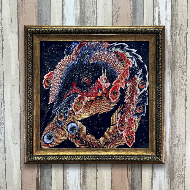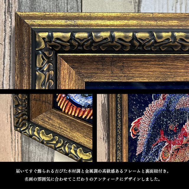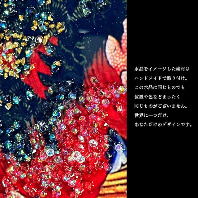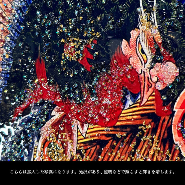 | 特徴 | ・水晶はハンドメイドで飾りつけし、高級感と立体感にこだわりました。 ・太陽光や照明の光を複雑に透過や屈折で光の乱舞を作り出して楽しむことができます。 ・飾る場所の照明の色味によって雰囲気が変わります。 ・上品な木材調と金属調の高級感あるフレームと裏面紐付き。 |
