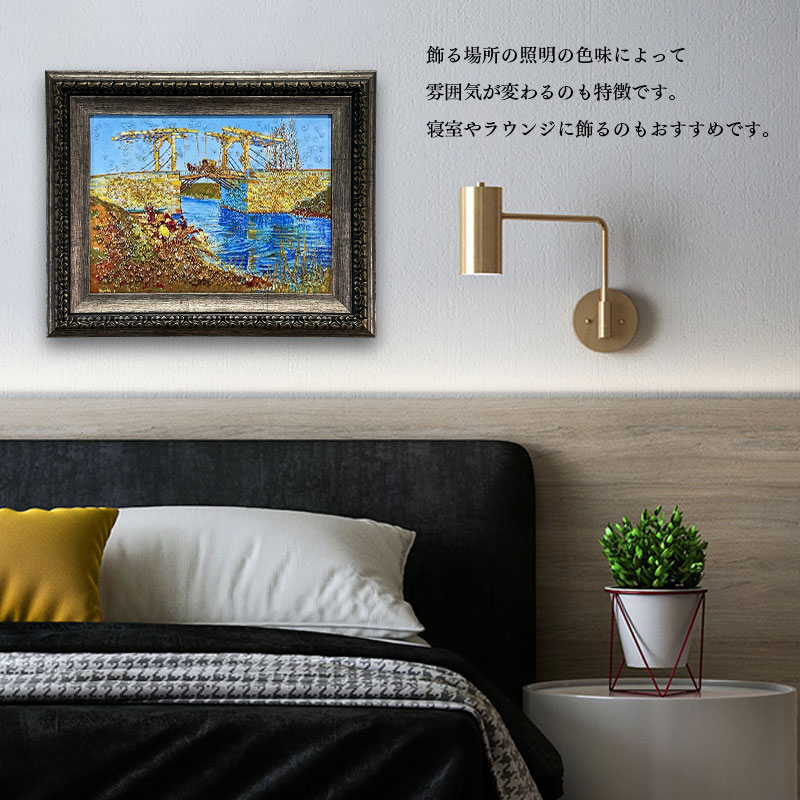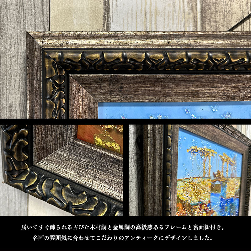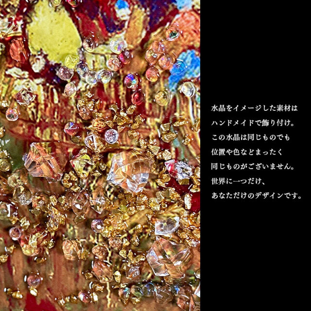 | 特徴 | ・水晶はハンドメイドで飾りつけし、高級感と立体感にこだわりました。 ・太陽光や照明の光を複雑に透過や屈折で光の乱舞を作り出して楽しむことができます。 ・飾る場所の照明の色味によって雰囲気が変わります。 ・上品な木材調と金属調の高級感あるフレームと裏面紐付き。 |