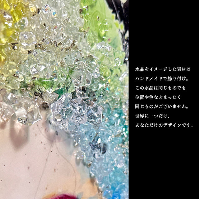 | 特徴 | ・水晶はハンドメイドで飾りつけし、高級感と立体感にこだわりました。 ・太陽光や照明の光を複雑に透過や屈折で光の乱舞を作り出して楽しむことができます。 ・飾る場所の照明の色味によって雰囲気が変わります。 ・上品なブラックカラーのフレームと裏面紐付き。 |