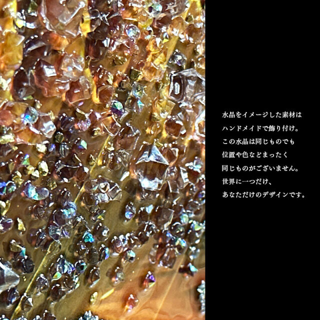 | 特徴 | ・水晶はハンドメイドで飾りつけし、高級感と立体感にこだわりました。 ・太陽光や照明の光を複雑に透過や屈折で光の乱舞を作り出して楽しむことができます。 ・飾る場所の照明の色味によって雰囲気が変わります。 ・上品なゴールドカラーのフレームと裏面紐付き。 |