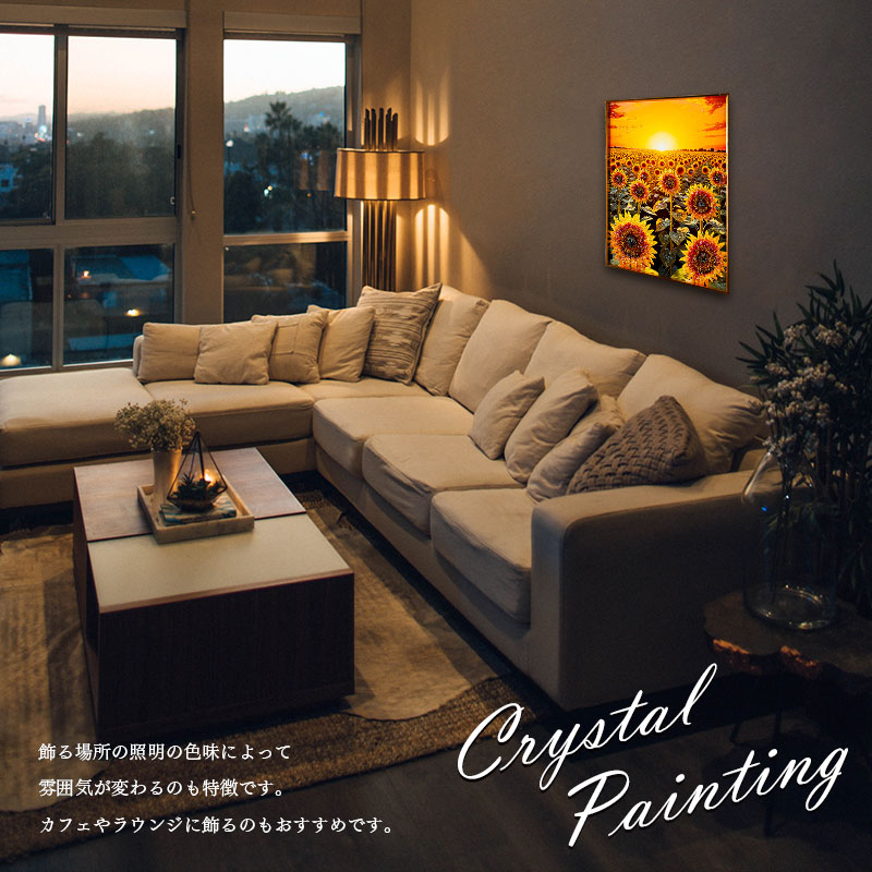 | 特徴 | ・水晶はハンドメイドで飾りつけし、高級感と立体感にこだわりました。 ・太陽光や照明の光を複雑に透過や屈折で光の乱舞を作り出して楽しむことができます。 ・飾る場所の照明の色味によって雰囲気が変わります。 ・上品なブラックカラーのフレームと裏面紐付き。 |