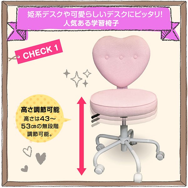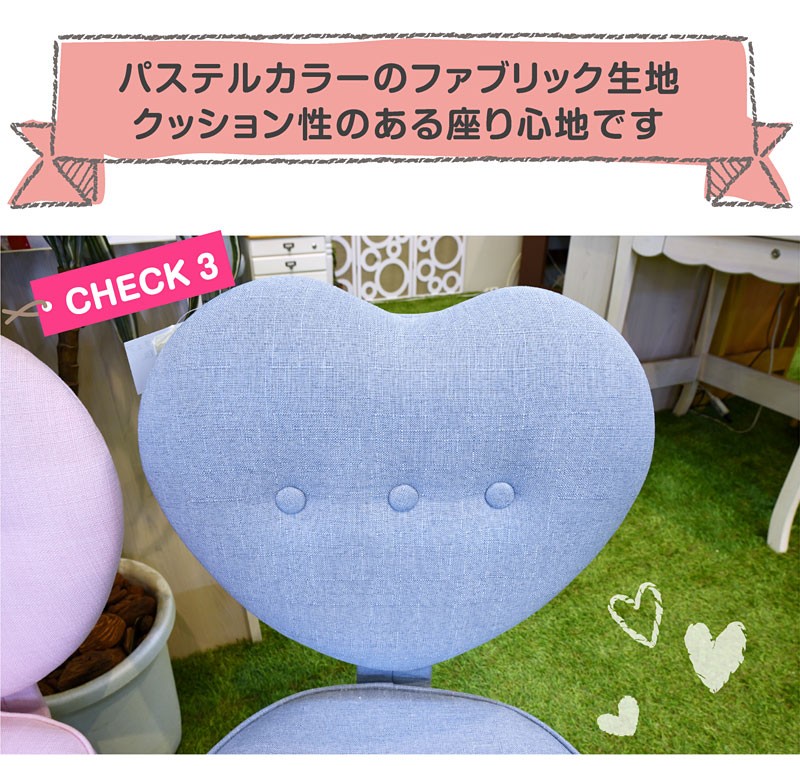 | 特徴 | ・ハート型の背もたれがかわいい学習椅子 ・選べる3色 ・組立品 |