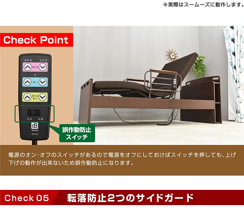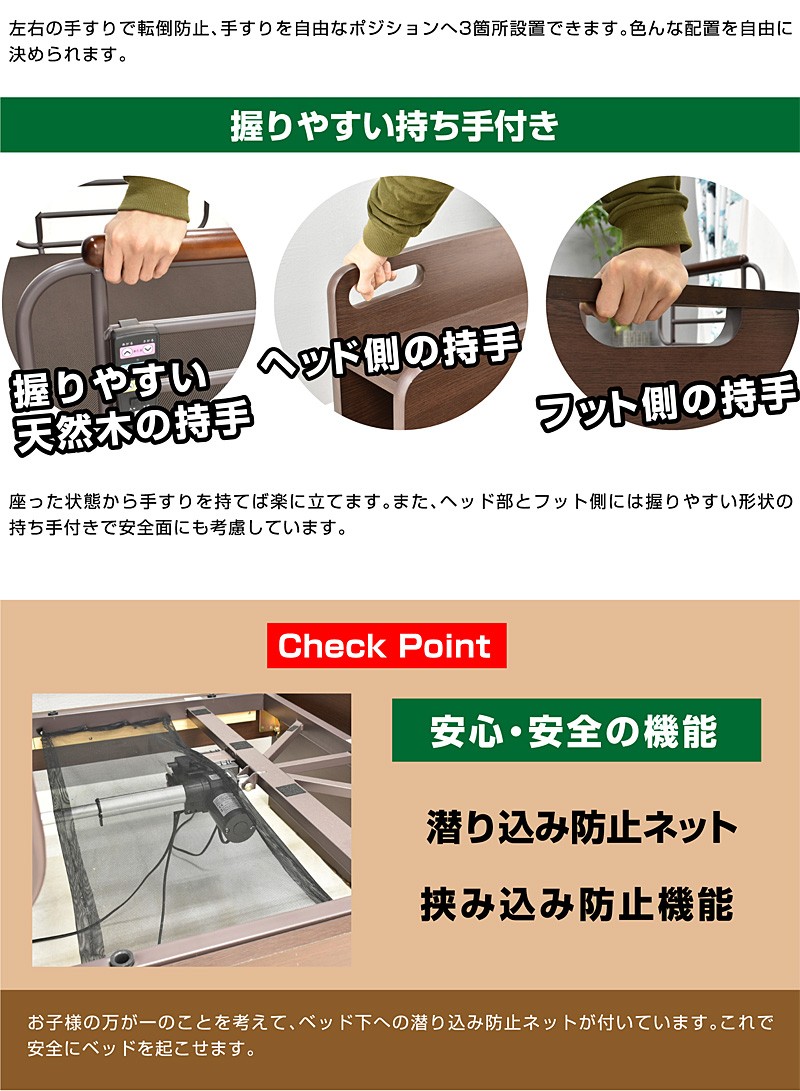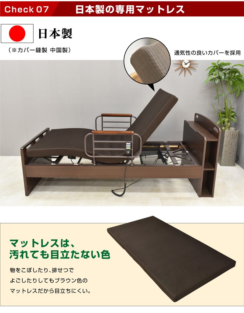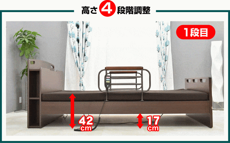| 仕様 | 【組立品】 ・介護に適した電動ベッドです。 ・2モーター(背上げ・足上げ別可動可能) ・便利なコンセントと本棚付き ・コードリモコン付きで、お手元でラクラク操作が可能です。 ・手すり2個/専用マットレス(日本製)付き ・起き上がりをサポート、腰痛対策に ・組立時に床板高さを4段階で選択可能 |