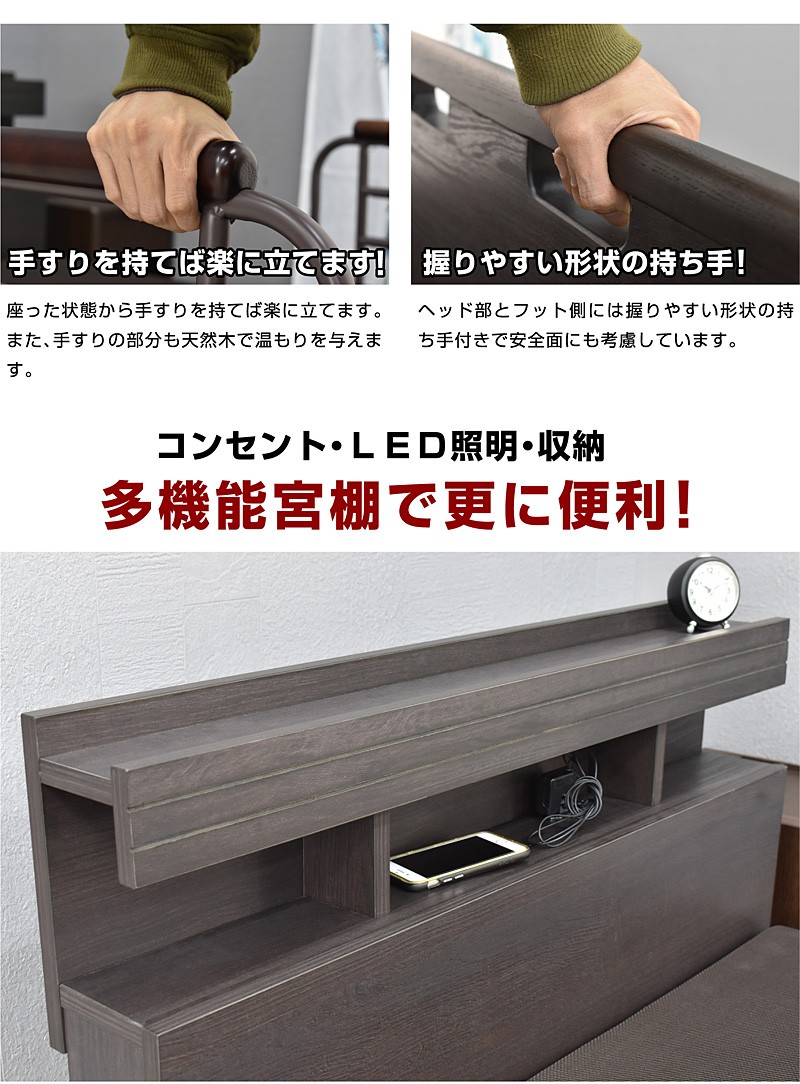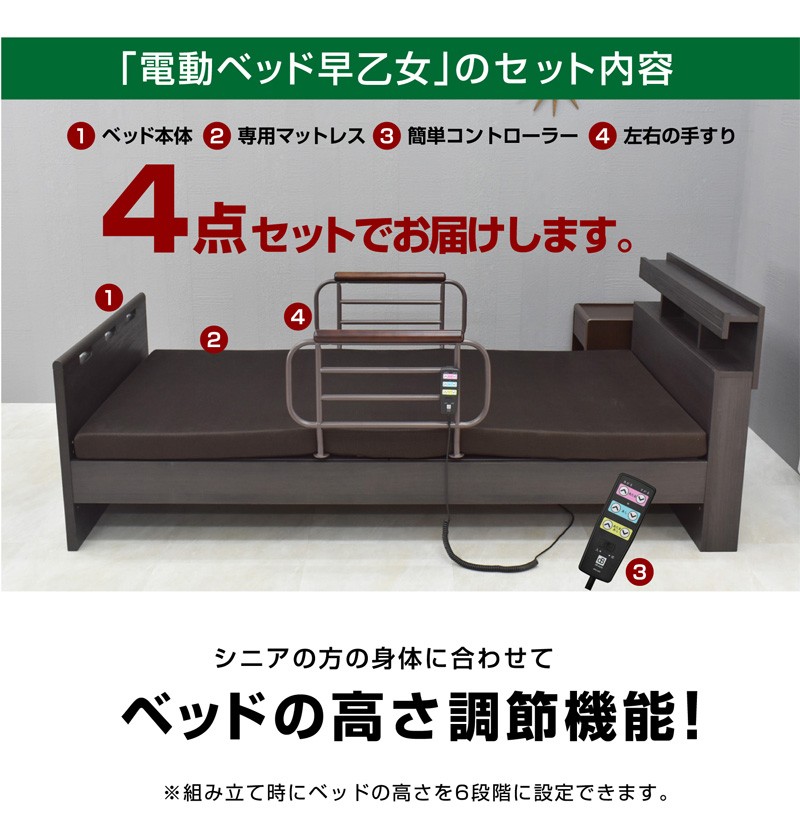 | 製品名: | 電動ベッド 介護ベッド 2モーターベッド シングル 木製 大人用 子供 コンセント LED照明付き 手すり付き 非課税 早乙女 |