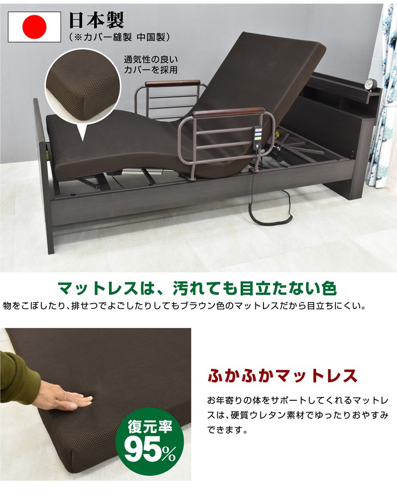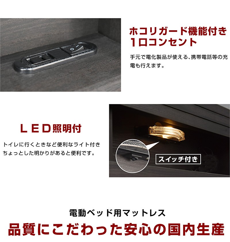| 仕様 | 【組立品】 ・介護に適した電動ベッドです。 ・2モーター(背上げ・足上げ別可動可能) ・起き上がりをサポート、腰痛対策に ・便利なコンセントと照明付き ・コードリモコン付きで、お手元でラクラク操作が可能です。 ・手すり2個/専用マットレス(日本製)付き ・組立時に床板高さを6段階で選択可能 |