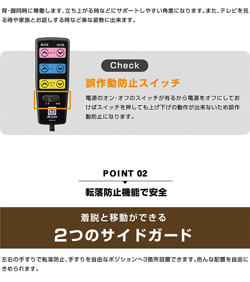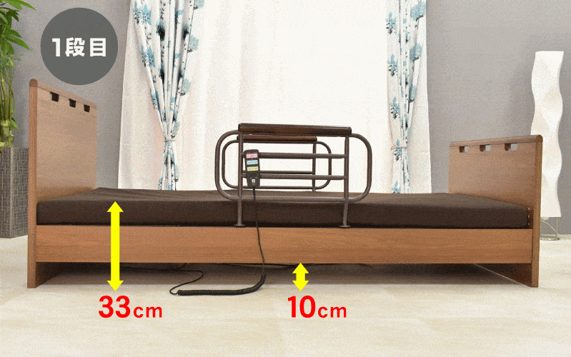 | 仕様 | 【組立品】 ・介護に適した電動ベッドです。 ・2モーター(背上げ・足上げ別可動可能) ・コードリモコン付きで、お手元でラクラク操作が可能です。 ・起き上がりをサポート、腰痛対策に ・手すり2個/専用マットレス(日本製)付き ・組立時に床板高さを6段階で選択可能 |
