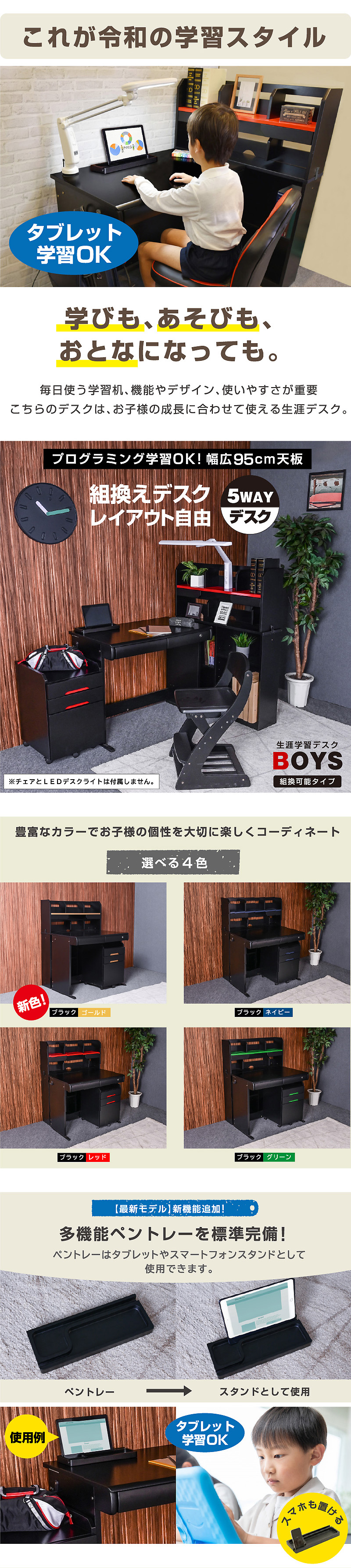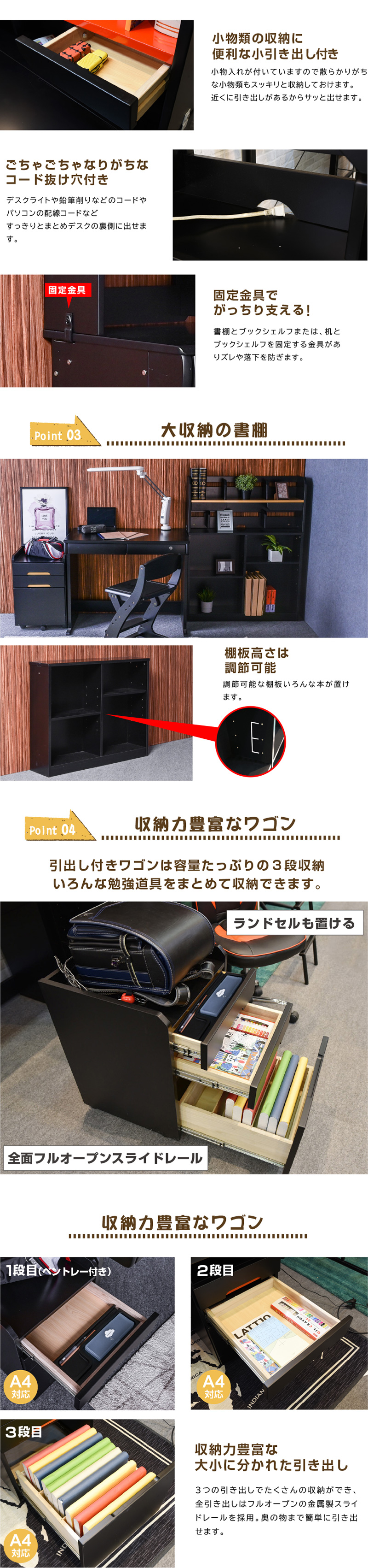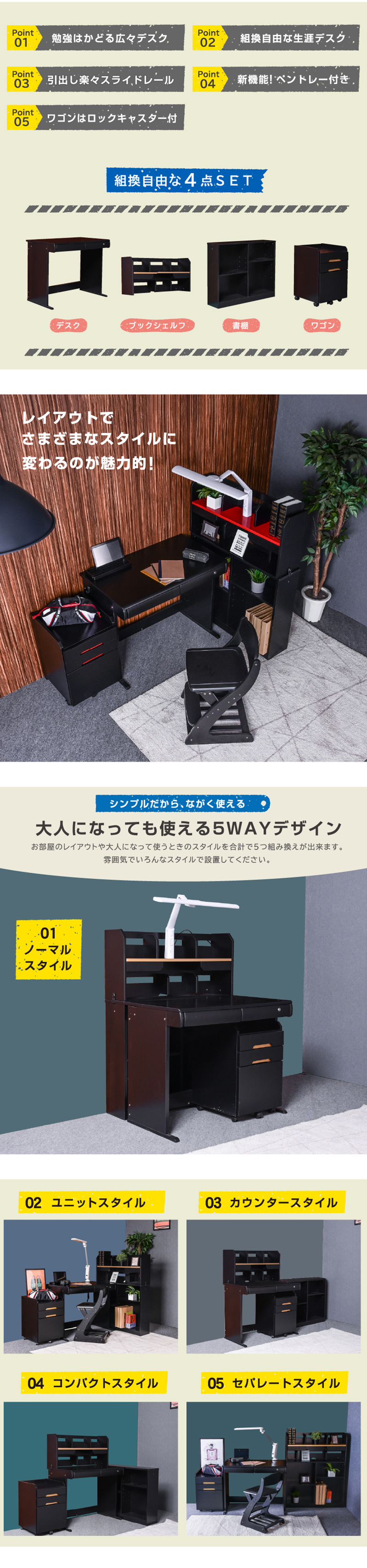 | 特徴 | ・新機能、ダブレットやスマホがスタンドとして使えるペントレー付き ・勉強がはかどる広々デスク5WAY ・組み換え自由な生涯デスク ・引出し楽々スライドレール ・ワゴンはロックキャスター付き |