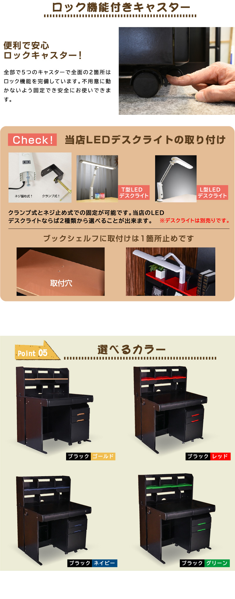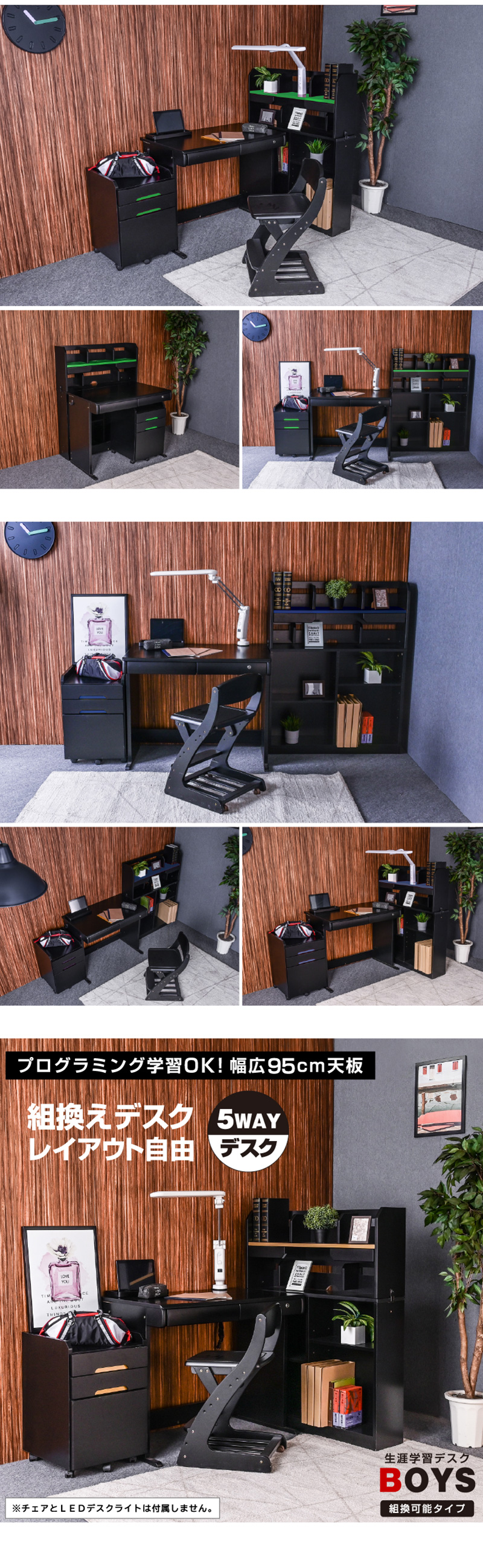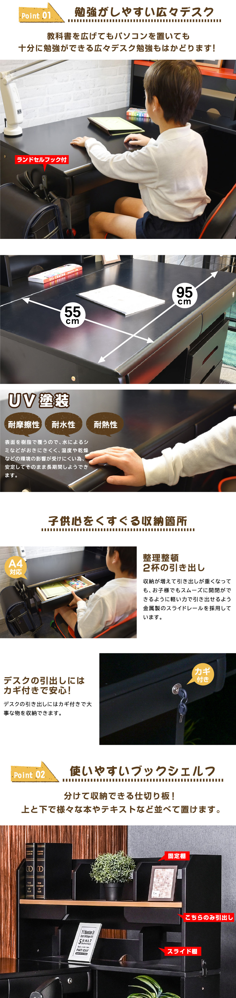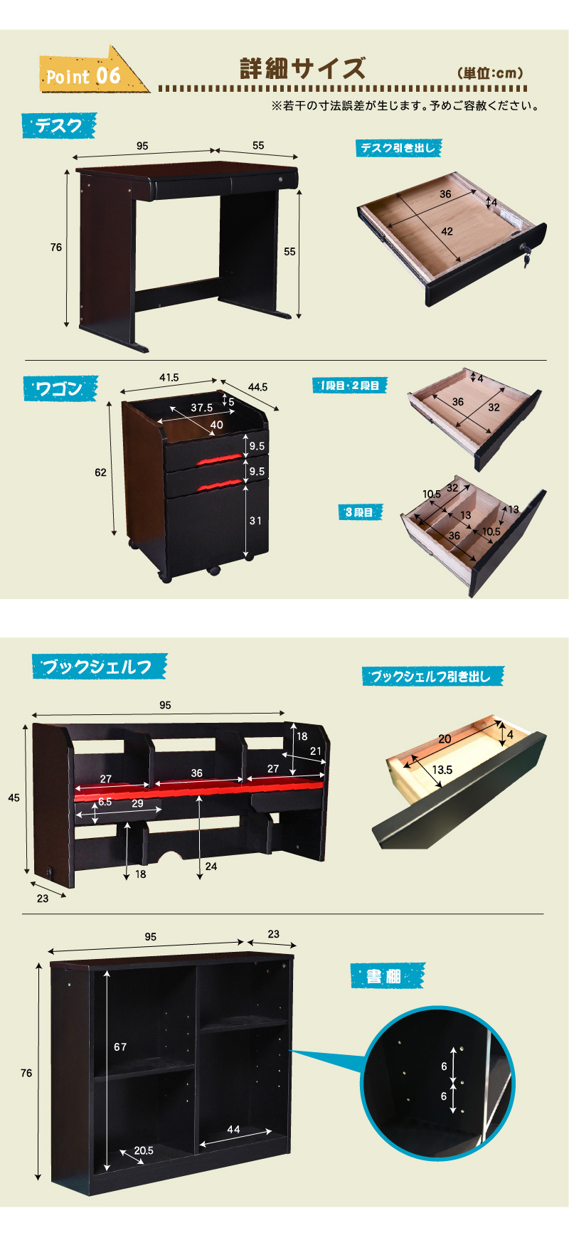 ■内容 学習机4点セット(デスク、ブックシェルフ、書棚、ワゴン) ■デスクカラー ブラックレッド・ブラックゴールド・ブラックネイビー・ブラックグリーン ■サイズ 本体:幅95×奥行55×高さ76(cm) 書棚:幅95×奥行23×高さ121(cm) ■材質 MDF ■仕様 UV塗装・全段フルオープンレール ■原産国 タイ ・画像にある学習椅子、デスクライト、小物は付属していません。 ※実物に近い状態で撮影していますが、撮影時の光の加減やお客様のPC設定により若干の色合いが異なる場合がございます。 ※曲線部分や若干の個体差により、多少の誤差が生じることがございます。 ※旧タイプのレビューも含まれています。予めご了承ください。 【送料無料】 ただし、東北・北海道・沖縄は追加送料が必要となります。(離島は別途お見積り) ※追加料金が必要な場合、買い物カゴでは再計算されません。料金確定後、こちらからご連絡させていただきます。