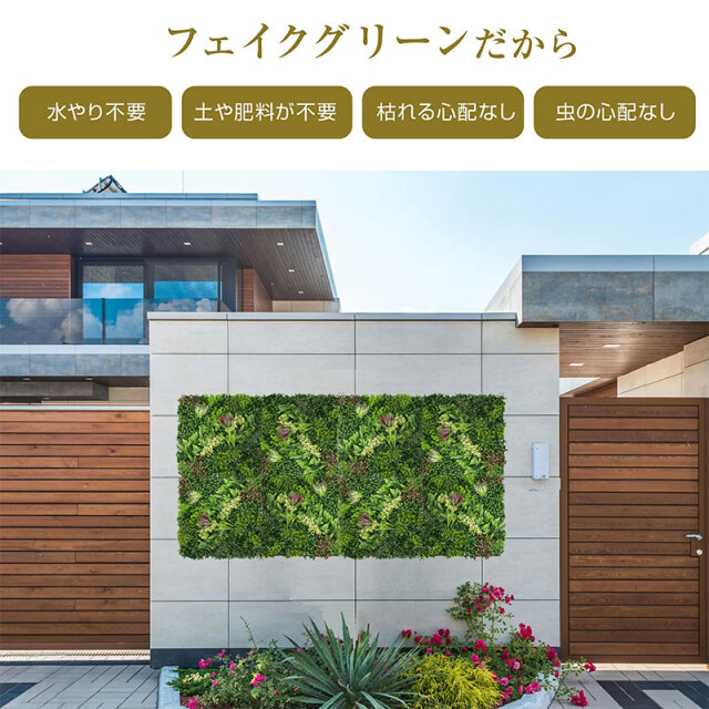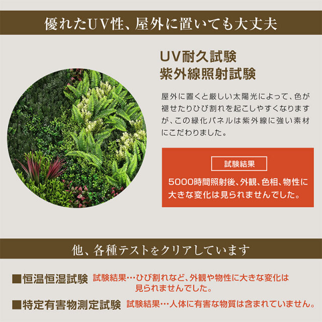 ・リアルな見た目にこだわった人工壁面緑化パネル ・自然な見た目になるように3パターンの模様を準備 ・自由に組み合わせて、自然なランダム感を作ります ・日当たりや水やりの心配がなく、屋内外どんな場所にも設置可能 ・UV耐久試験、紫外線照射試験、特定有害物側転試験、恒温恒湿試験クリア |