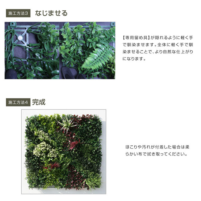 【組立時サイズ(cm) 】W100cm×H100cm 【種類】3種類 【素材(本体)】ポリエチレン樹脂 【素材(固定具)】 土台:ABS樹脂、キャップ:ポリエチレン ピン:ステンレス 【付属品】専用留め具8セット (土台:8個、キャップ8個、ピン:24本) 【特徴】 ・リアルな見た目にこだわった人工壁面緑化パネル ・自然な見た目になるように3パターンの模様を準備 ・自由に組み合わせて、自然なランダム感を作ります ・日当たりや水やりの心配がなく、屋内外どんな場所にも設置可能 ・UV耐久試験、紫外線照射試験、特定有害物側転試験、恒温恒湿試験クリア 【お手入れ方法 】 ・ほこりがついた場合は柔らかい布やはたきで取り除いてください ・色落ちの原因になる場合があるので、水洗いはしないでください ・葉が落ちてしまう場合がございます。その時はベースに差し込むか、接着剤で固定してください 【ご注意】 ※お使いのモニターや照明器具等で実際の色とは若干異なって見える場合もございます